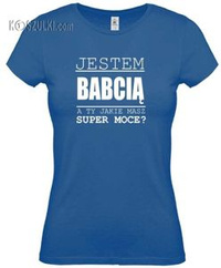 Niebieska koszulka dla kobiet z nadrukiem Jestem Babcią, a Ty jakie masz super moce?